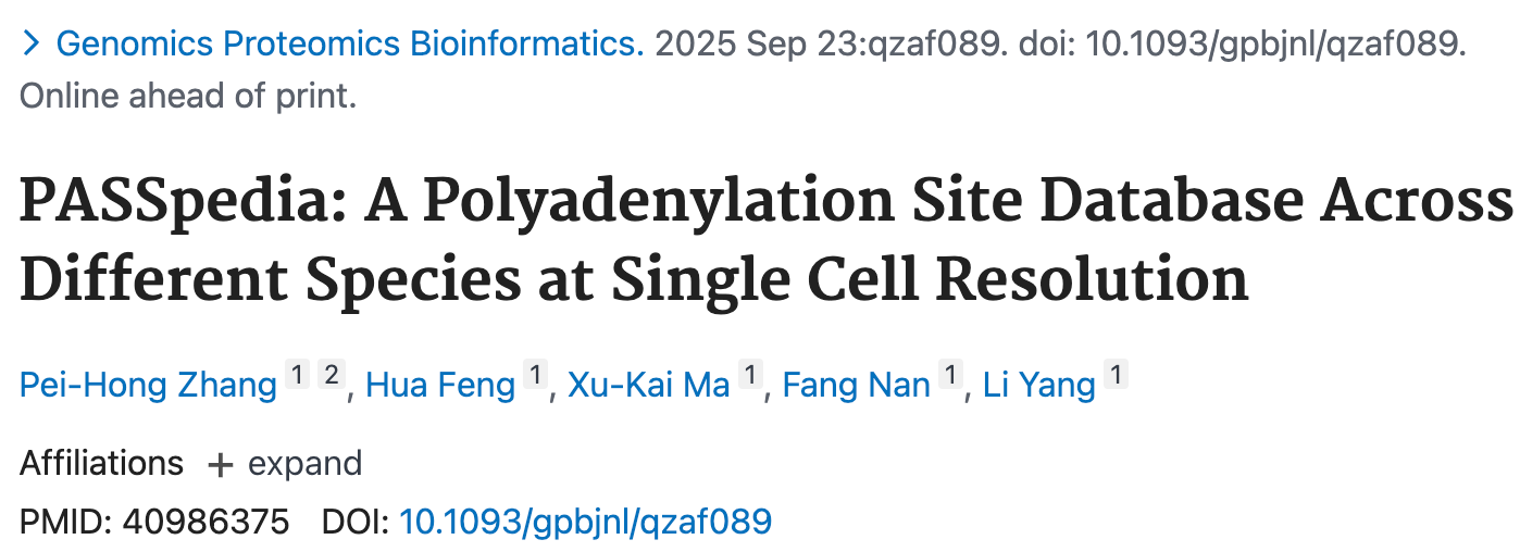 2025年09月23日,复旦大学生物医学研究院/复旦大学附属儿科医院杨力团队在Genomics Proteomics Bioinformatics在线发表了题为PASSpedia: A Polyadenylation Site Database Across Different Species at Single Cell Resolution的论文,报道了一个单细胞分辨率的多物种多聚腺苷酸化位点(polyadenylation sites, PAS)大百科全书数据库-PASSpedia(https://bits.fudan.edu.cn/PASSpedia/)。