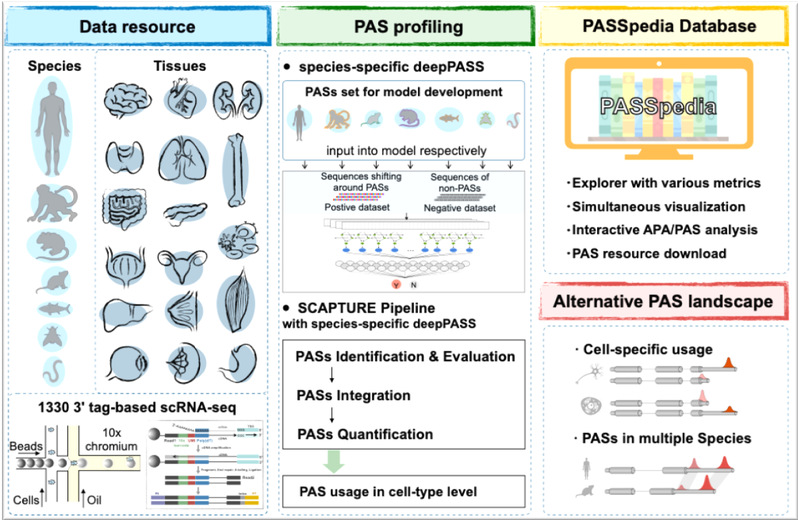 真核(mRNA)的成熟依赖于多种共转录及转录后事件的协同调控,包括5'端加帽、(可变)剪接、RNA编辑/修饰以及3'端(多聚腺苷酸化,polyadenylation)加尾等多个关键步骤。多聚腺苷酸化加尾作为一种重要的加工过程,广泛参与RNA命运和功能调控,对于RNA的稳定性、亚细胞定位及翻译效率等至关重要。因此,精确鉴定多聚腺苷酸化位点(polyadenylation sites, PAS)及可变多聚腺苷酸化(alternative polyadenylation, APA)事件,对于深入揭示其生物学功能及生理病理的调控机制具有重要意义。传统的PAS鉴定方法一般依赖于特殊的3'序列富集测序(如3'-READS等),研究组前期开发了一种基于深度学习模型的单细胞精度PAS鉴定分析流程SCAPTURE(Li et al., Genome Biol, 2021),可从3'-tag单细胞测序数据中实现PAS位点的准确识别、筛选和定量。在这一项最新的研究中,团队进一步构建了物种特异的PAS位点分析流程SCAPTURE v2,利用海量3'-tag单细胞测序数据实现了多物种中单细胞精度的PAS位点准确识别,进一步揭示了物种间PAS位点的选择偏好,并据此构建了多物种PAS大百科全书数据库PASSpedia,其涵盖七物种、多组织的单细胞PAS位点搜索、浏览、分析、比较和下载等功能(图1),为PAS鉴定及其调控的相关研究提供了跨物种数据支持。