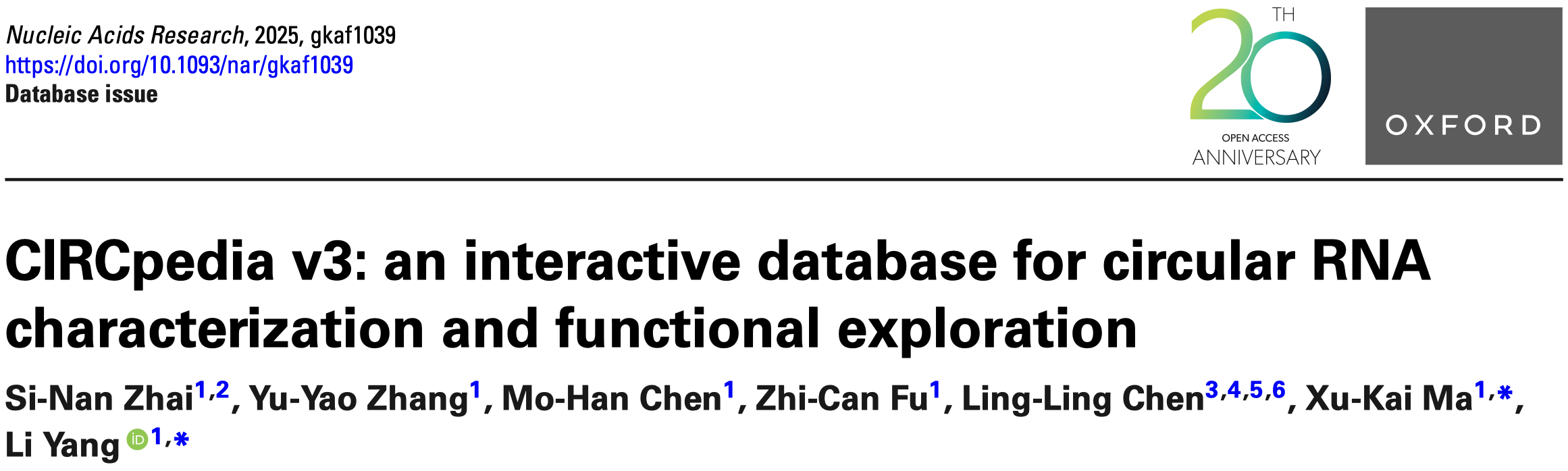 2025年10月22日,复旦大学生物医学研究院/复旦大学附属儿科医院杨力研究组在Nucleic Acids Research杂志在线发表了题为CIRCpedia v3: an interactive database for circular RNA characterization and functional exploration的论文,报道了升级版的环形RNA数据库CIRCpedia(https://bits.fudan.edu.cn/circpediav3)。
