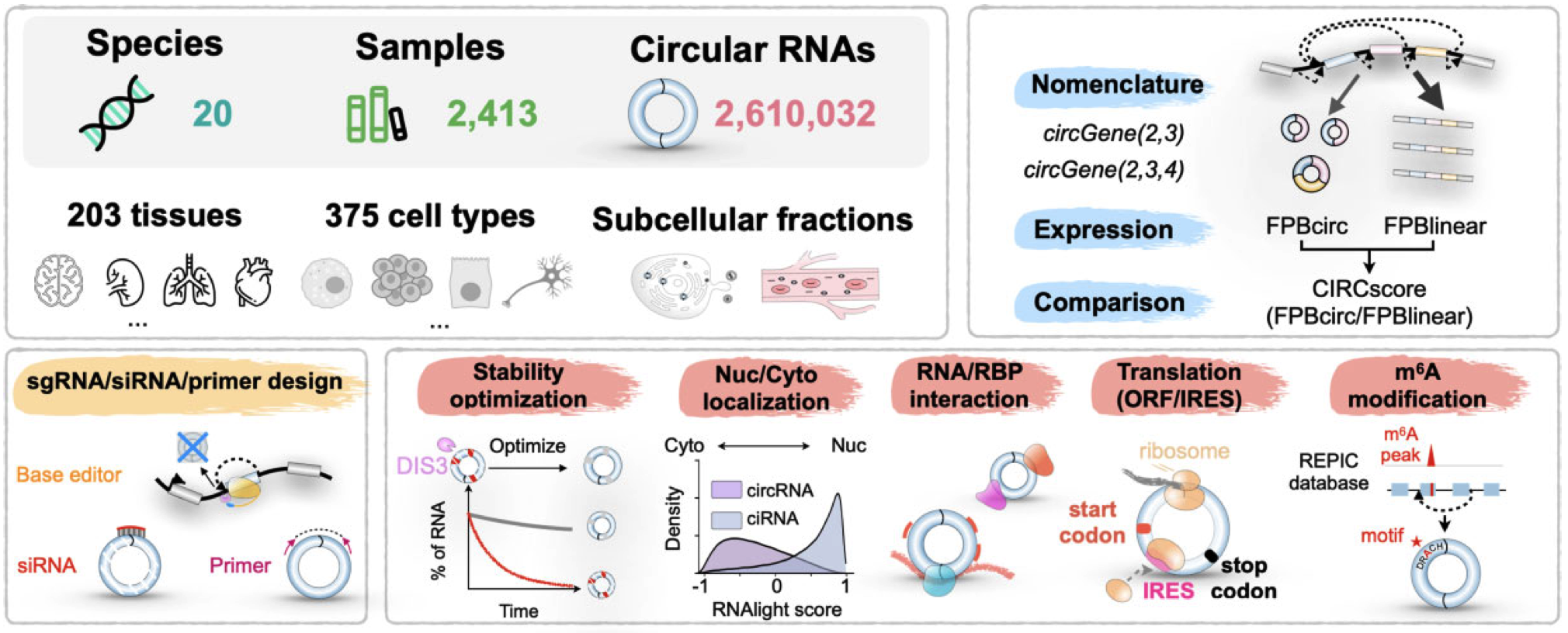 反向剪接产生的环形RNA(circRNA)因其特殊的共价闭合环结构,相较于同源线性RNA展现出独特的高级结构特征及低细胞免疫原性。通过多样化的分子机制,环形RNA可广泛参与调控各类细胞活动,并与不同的生理调控和病理状态密切相关。近期,迅速积累的高通量(二代/三代)测序数据揭示了环形RNA的普遍存在,为相关研究提供了宝贵的数据资源。最新报道的CIRCpedia v3数据库系统性整合了来自20个物种的2413个RNA测序样本,覆盖了203种组织类型和375种细胞系以及多种亚细胞组分,成功注释了超过260万个环形RNA。升级版的CIRCpedia v3:1)依据领域内共识,为每个环形RNA提供了规范化命名,准确区分来源于同一基因的多个不同环形RNA,为学术研究和科研交流提供了便利;2)采用统一的FPB参数对环形RNA及同源线性RNA进行标准化定量分析,实现了两者表达水平的直接对比;3)提供了样本间环形RNA表达水平的在线比较分析及可视化展示功能,可以有效协助用户筛选特定环境下潜在的功能性环形RNA;4)集成了多种工具,为环形RNA功能研究提供了全方位的注释信息、功能预测、实验设计和序列优化方案,包括碱基编辑器sgRNA/siRNA/引物设计工具、DIS3偏好降解序列检测及稳定性优化、亚细胞定位预测、RNA/RBP分子相互作用预测分析、m6A修饰位点识别、翻译活性预测等(图1)。