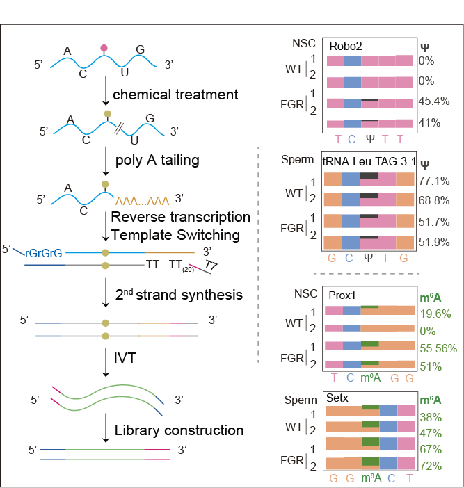 图1:胡璐璐课题组研发的Uli-epic技术流程(左)与使用Uli-epic检测到的胎儿生长受限(FGR)小鼠的神经干细胞(NSC)和精子(sperm)的异常m6A和假尿嘧啶(Ψ修饰)。