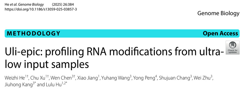 复旦大学生物医学研究院胡璐璐课题组与同济大学康九红课题组联合开发了一种创新的文库构建策略Uli-epic,该策略结合了化学基础的RNA修饰检测技术,可在极低量的RNA样本中精确检测表观转录组修饰。相关研究成果于2025年11月11日以Uli-epic: profiling RNA modifications from ultra-low input samples为题已发表于Genome Biology杂志。