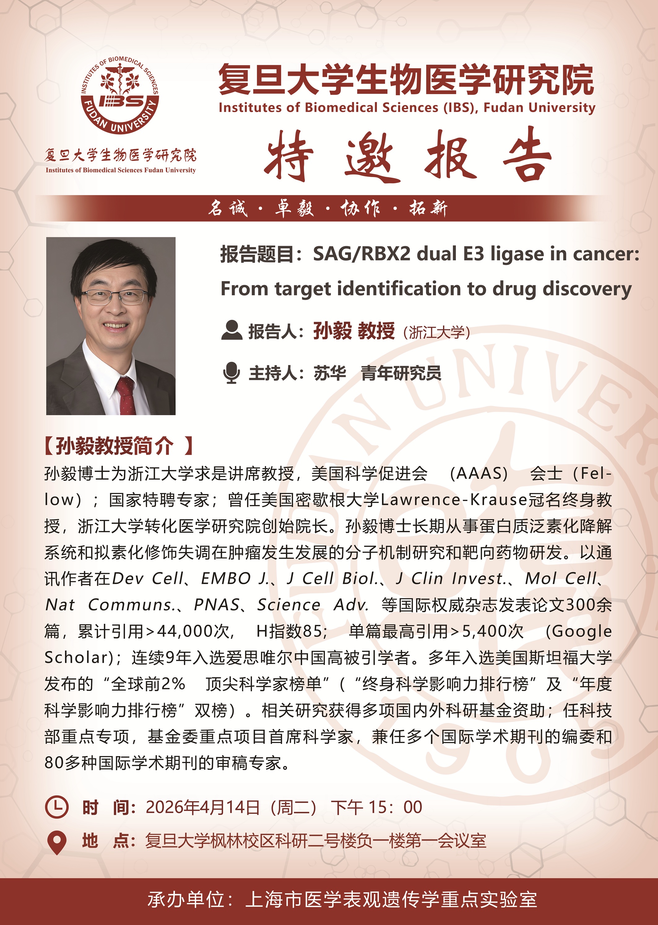 特邀报告:SAG/RBX2 dual E3 ligase in cancer: From target identification to drug discovery(浙江大学孙毅)