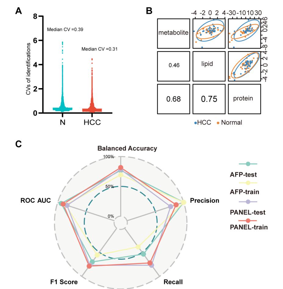 研究团队将该方法应用于31例早期肝细胞癌患者和37例健康对照的血小板样本分析,多组学数据的中位CV0.31-0.39(图3A,显示出良好的检测重复性。多组学整合分析显示,蛋白质组与脂质组、蛋白质组与代谢组之间具有强相关性(相关系数分别为0.750.68(3B),印证了蛋白质在小分子代谢中的核心调控作用。