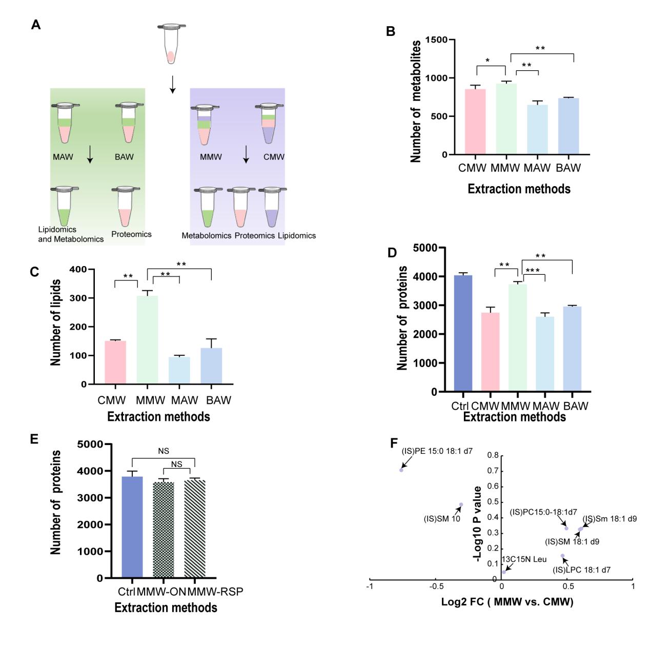 传统多组学分析通常需要将样本分成几份分别进行多步骤处理,耗时超过24小时,且对样本量要求较高,难以适用于血小板等样品量较少或者比较珍贵的临床样本。研究团队系统比较了四种常用溶剂提取方法(CMWMMWMAWBAW),发现MMW法(甲基叔丁基醚/甲醇/水)在脂质和代谢物提取效率上具有显著优势(图1A-C,F